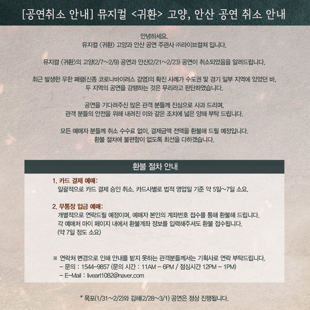 #뮤지컬#귀환 [公演取消のご案内] 高揚と安山公演はキャンセルになりました。 最近発生した武漢肺炎感染事例で二つの地域での公演強行は無理だと判断しました。 観客の方々の安全のために下された措置に広いご理解をお願い致します。 払い戻し関連詳細は画像参照をお願いします。https://twitter.com/Insight_Since96/status/1222417669921443842 …