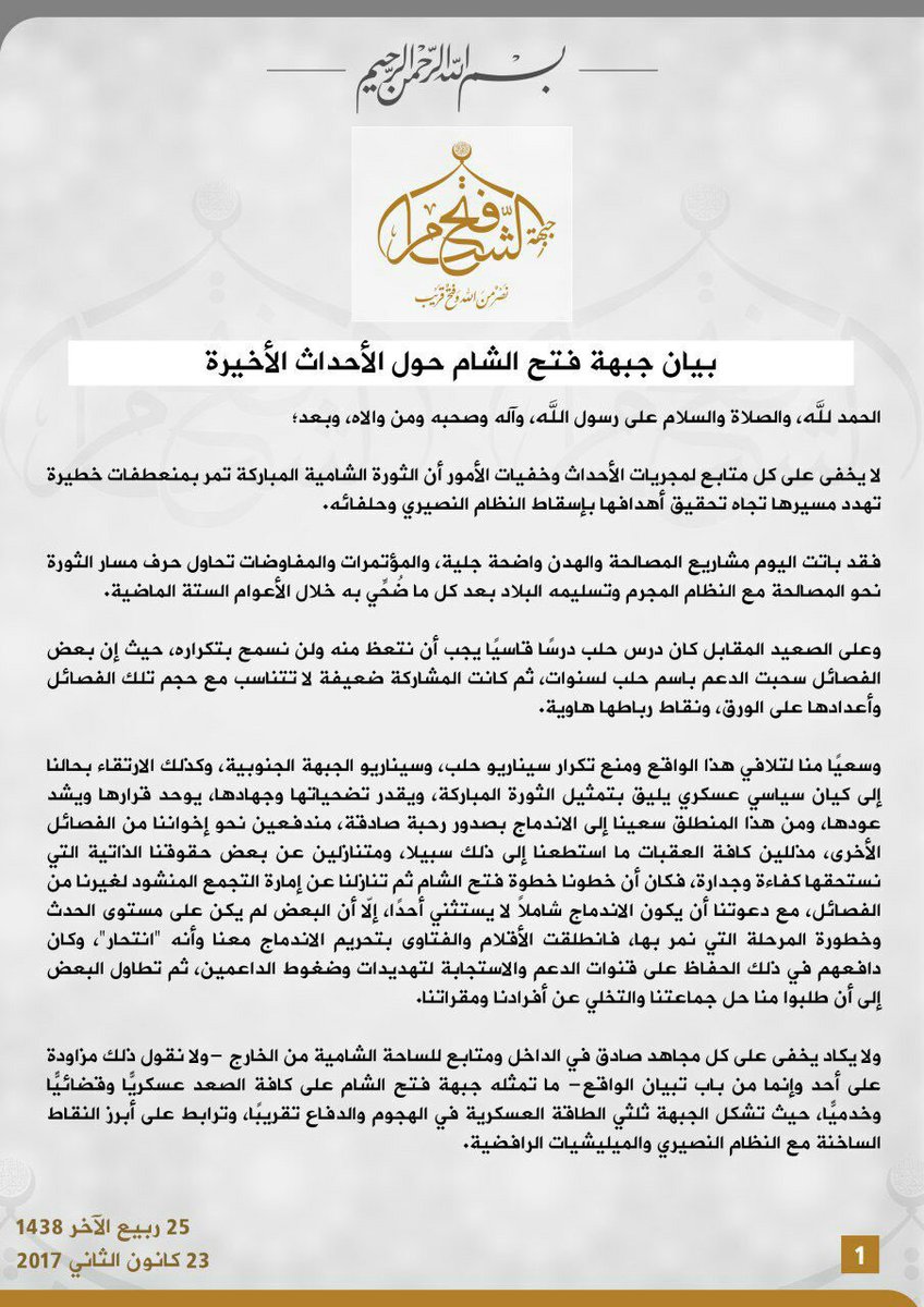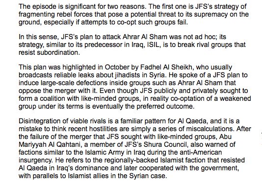 JFS's statement about the reasons why it waged war against rebel groups like Jaish al-Mujahideen and Levant Front: to abort the conspiracy>>pic.twitter.com/y1AIrWWOG6