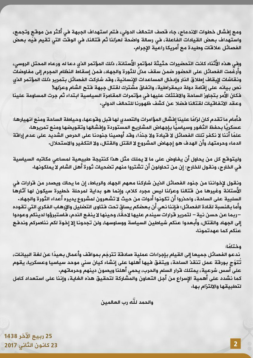 JFS: We say to fighters with factions who sided with us, the plotting & decisions in Astana about fighting or isolating us aren't just talk.
