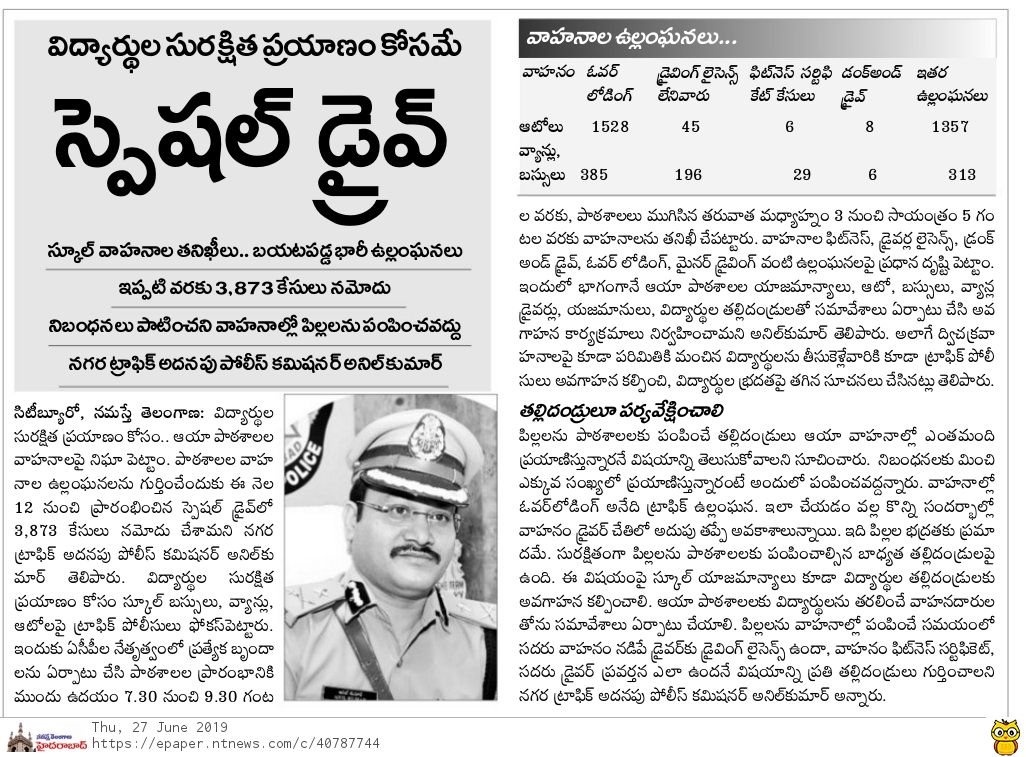 Hyderabad Traffic Police in a special drive has booked 3873 cases since June 12 on vehicles carrying school children; 14 of the those drivers were found drunk. Additional Commissioner of Traffic, Anil Kumar, says, "2,944 cases were booked on autos & 929 on school vans & buses"pic.twitter.com/FhkgxKL2av