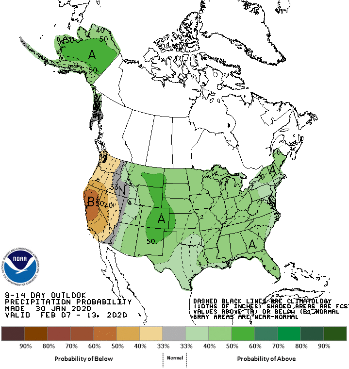 February 7th through 13th are forecast to see increased chances for above-normal precipitation nationwide with the exception of parts of the Pacific Northwest, California, and Nevada. https://www.cpc.ncep.noaa.gov/products/predictions/814day/ …pic.twitter.com/un6SkQsrGd