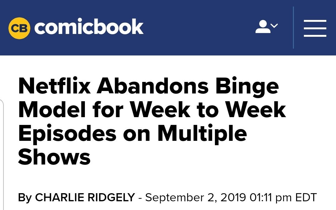 Social media trends better on weekly releases vs whole series releases. I figured this was coming. This will also give Netflix flexibility to cancel underperforming series midseason vs their current pay for a whole season and cancel later.https://twitter.com/ComplexPop/status/1168927484118745091 …