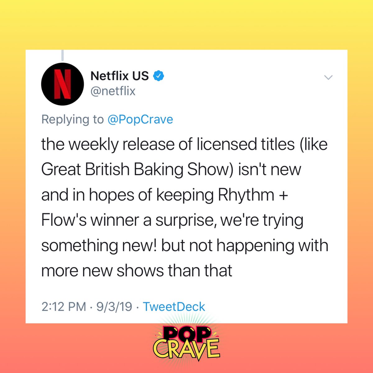 the weekly release of licensed titles (like Great British Baking Show) isn't new and in hopes of keeping Rhythm + Flow's winner a surprise, we're trying something new! but not happening with more shows than that