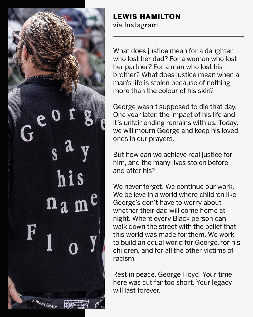 One year after George Floyd's murder, Lewis Hamilton says the world must continue to work for equality to honour Floyd's legacy.pic.twitter.com/2KolnHQoR3