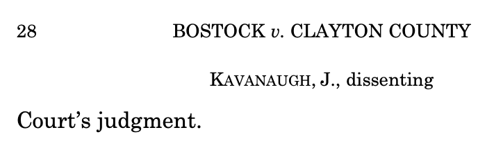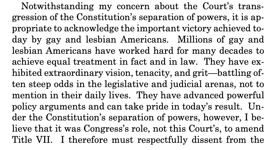 Kavanaugh in dissent:"It is appropriate to acknowledge the important victory achieved today by gay & lesbian Americans..They have advanced powerful policy arguments & can take pride in today’s result..However, I believe it was Congress’s role,not this Court’s,to amend Title VII."pic.twitter.com/kvbqE3q6Mo