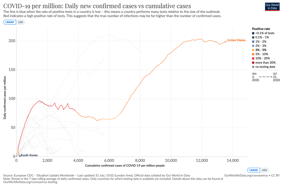You can see how quickly country bent the curve by plotting the daily confirmed case rate against the cumulative rate. The US is now at 13,579 per million. South Korea bent the curve at a cumulative rate of 122 per million. [Here is the interactive chart http://ourworldindata.org/grapher/rate-daily-new-confirmed-cases-of-covid-19-vs-cumulative-cases-positive-rate …]pic.twitter.com/GwO8FKa3pK