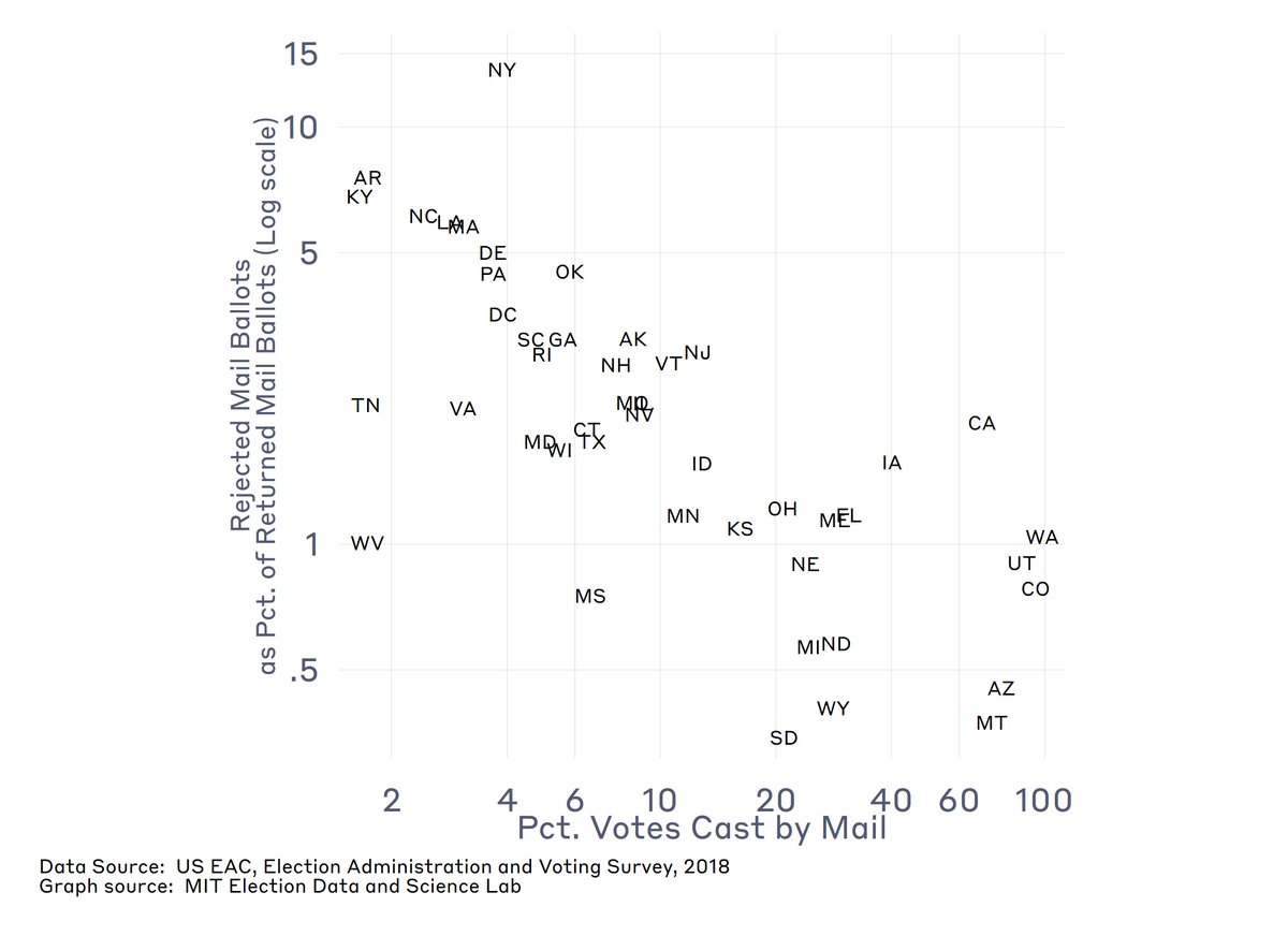 Because I've been asked about this so much, here is a graph that shows the relationship b/t rejected mail ballots (as % returned for counting) against the % of all ballots cast by mail. 2018.pic.twitter.com/16MZp7jTZC