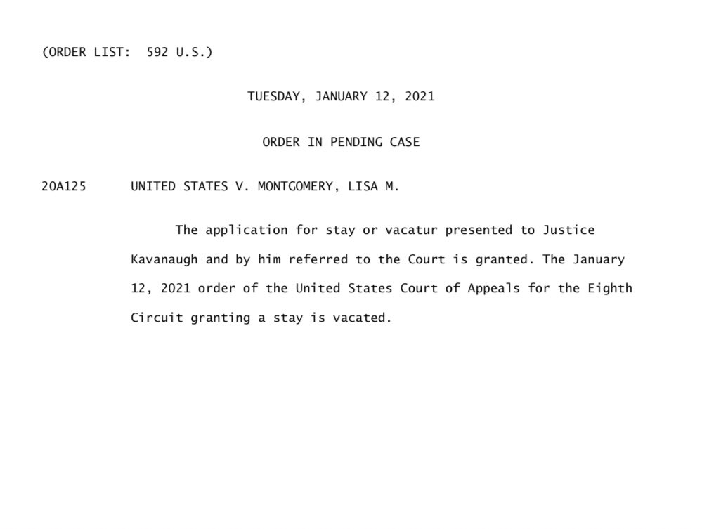 Update: The Supreme Court has vacated the stay from the 8th circuit for Lisa Montgomery’s execution. Her execution is likely imminent. The federal government has not executed a woman since 1953.https://twitter.com/keaux_/status/1349223930620506113 …