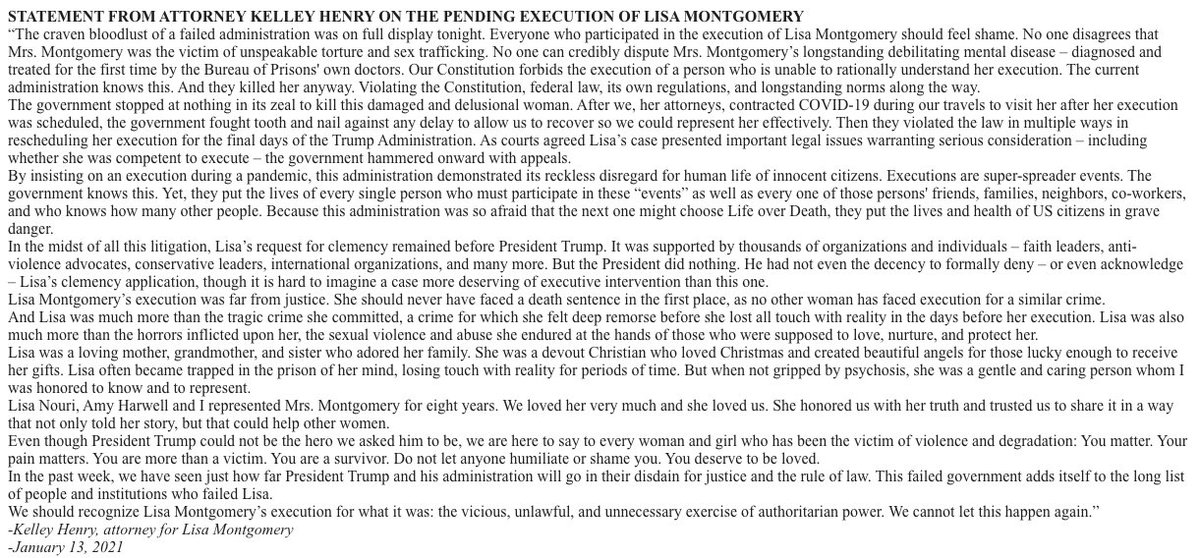 #LisaMongomery lawyer Kelley Henry after SCOTUS lifted the stay on her execution: “The craven bloodlust of a failed administration was on full display tonight.”pic.twitter.com/WaJfoVgbp0