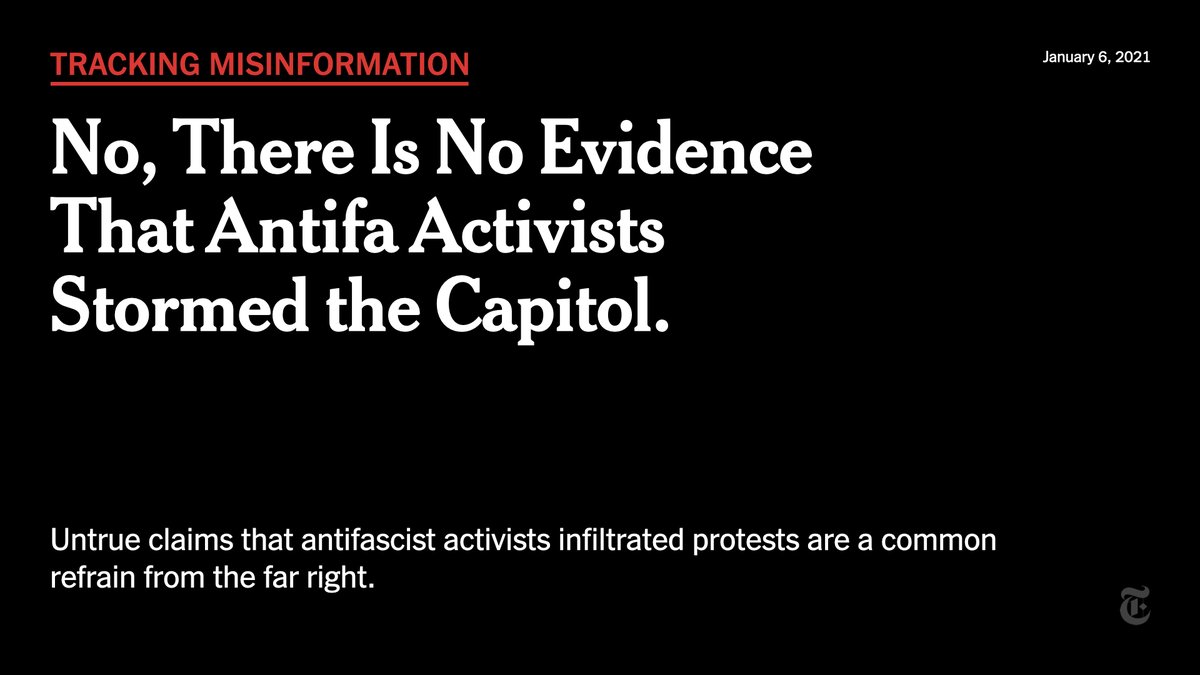 There is no evidence that the antifa movement — a loosely organized collective of antifascist activists — stormed the Capitol on Wednesday. https://nyti.ms/2L2PWIl pic.twitter.com/cDUKMbnWAL