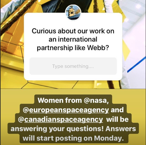#Webb is like? Ask us March 8th via Instagram Stories (@NASAWebb) during our#internationalwomensday Q&A session! Women from@NASA + partner orgs will be responding. (@northropgrumman@SpaceTelescope@BallAerospace@HarrisCorp@NASAGoddard)#JWSTpic.twitter.com/3dq3fqTHSc