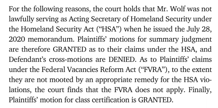 @DHS_Wolf was "not lawfully serving" as acting DHS secretary when he issued his DACA memo, a federal judge ruled. He grants class certification to Dreamers fighting to invalidate it. Doc inside. Story,@LambeJerry@LawCrimeNews https://lawandcrime.com/high-profile/federal-judge-rules-chad-wolf-was-not-lawfully-serving-as-dhs-head-when-he-issued-daca-memo/ …pic.twitter.com/u4pITxEovu