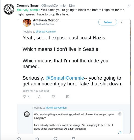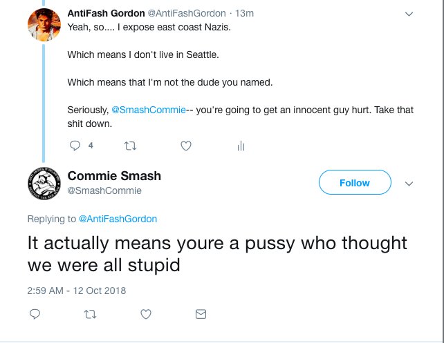 Have you noticed my Twitter bio? "I expose fascists in the Boston area." And you picked a fucking Seattle resident.pic.twitter.com/WIZBXeuDY1