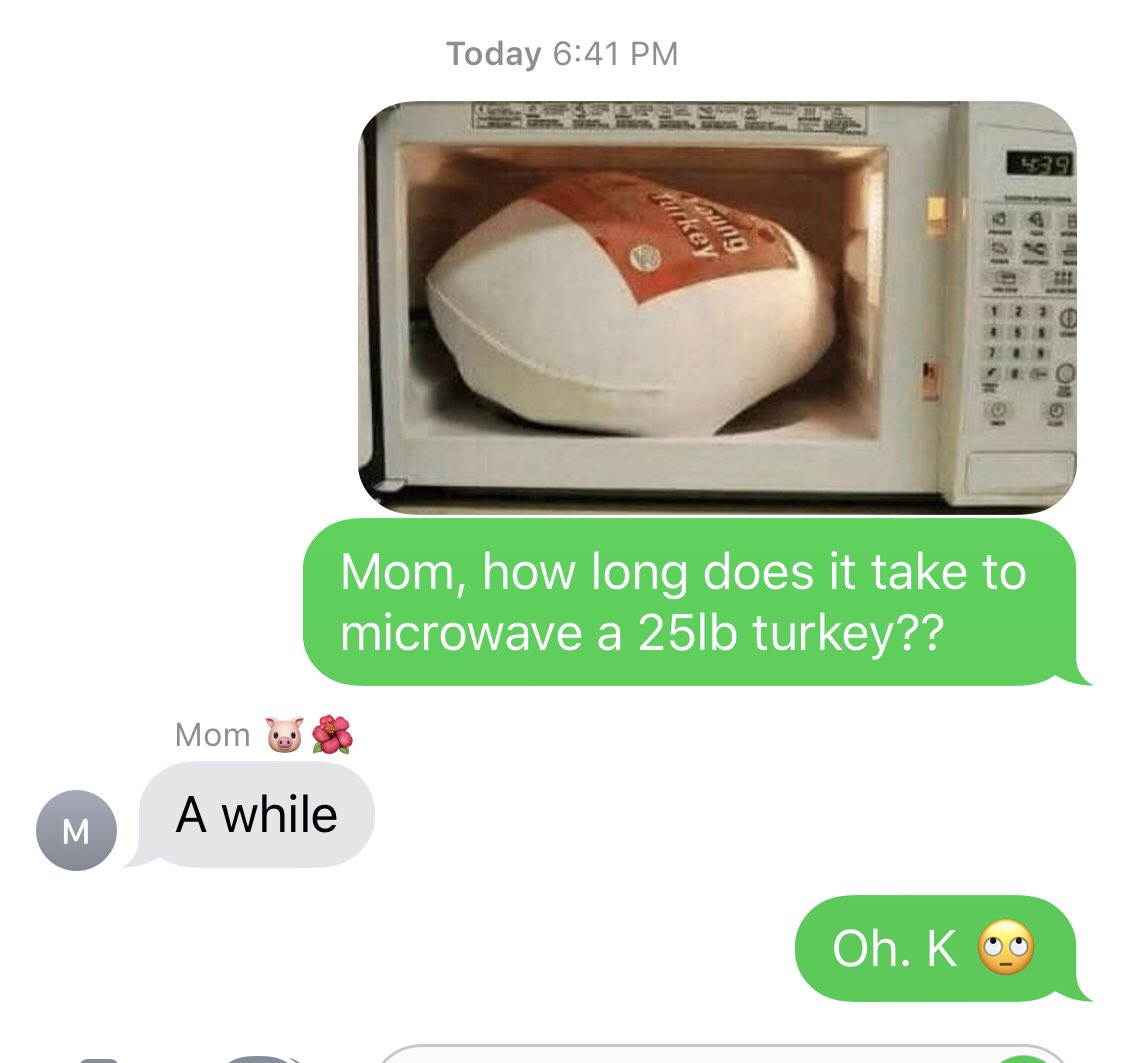“How do you cook a 25 pound turkey in the microwave?” I asked my own mom and well...pic.twitter.com/q2Q7aX8Xig