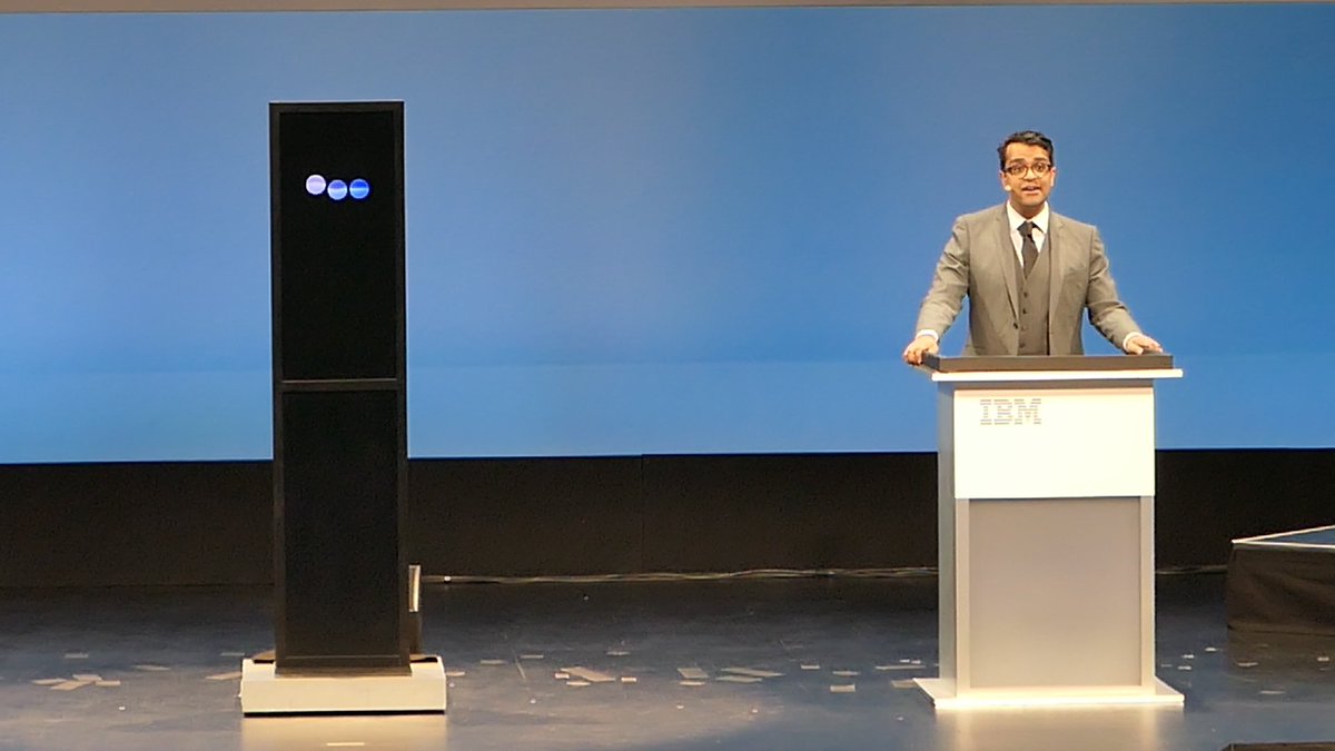 Very interesting listening to IBM #ProjectDebater vs human debater at #Think2019. #AI machine clearly has access to to myriad #data sources; Harish Natarajan very well spoken, appealing to the need for tough trade-off decisions. #DataScience #IBMPartner @IBMWatsonpic.twitter.com/Xzdj6kJNvO