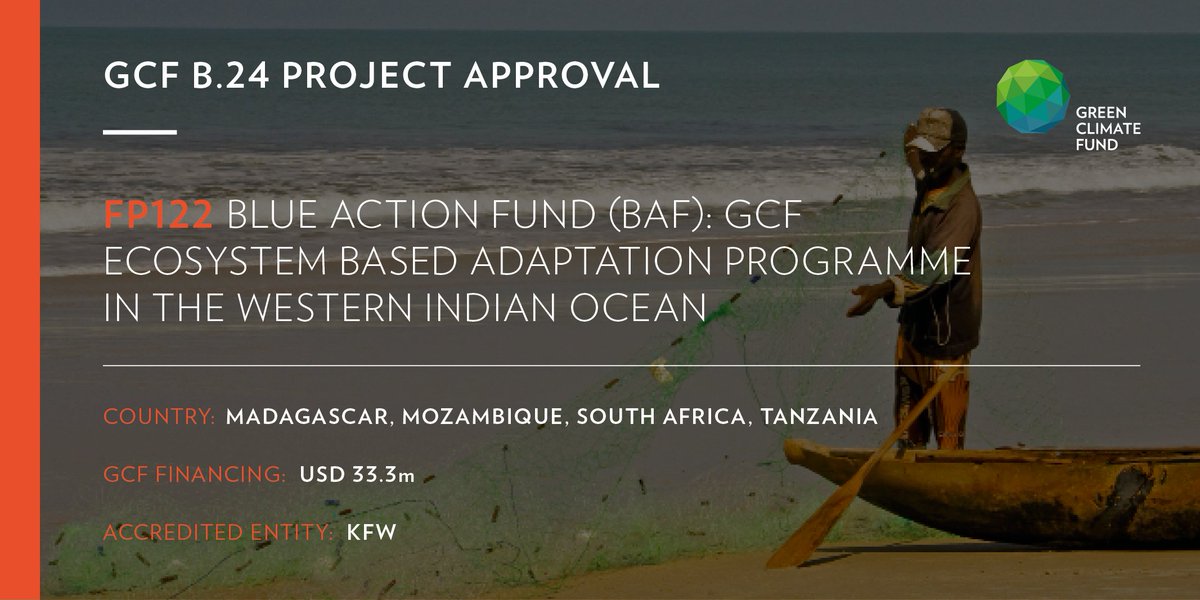 GCF Board #GCFB24 approved project FP122 with @KfW to reduce impacts of #ClimateChange through ecosystem-based #adaptation for vulnerable coastal populations and protect important marine and coastal ecosystems in the western #IndianOcean. Learn more: https://g.cf/fp122 pic.twitter.com/dckn0zgaXe