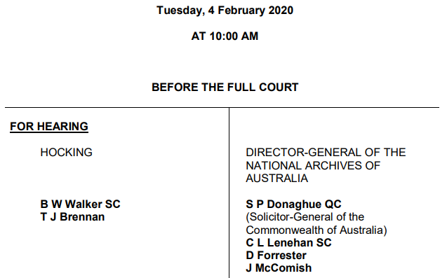 Oh boy, Hocking v National Archives tomorrow. What fun: https://www.hcourt.gov.au/assets/registry/court-lists/2020/4-2-20.pdf …pic.twitter.com/m1UD40yrZh