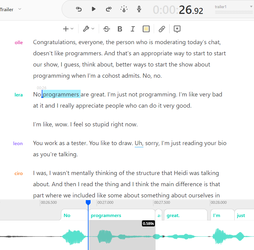 like almost in all cases ;-) good catch btw Anthony! on a good point, the AI was OKish a figuring out who says what and splitting the phrases into paragraphs. So. Progress!