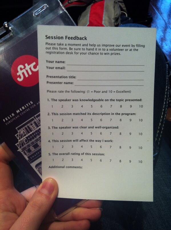 This is amazing idea - sessions feedback! I need to do the same at #DevGAMM to control quality of content. #FITCAM14pic.twitter.com/yxSnB7VimW