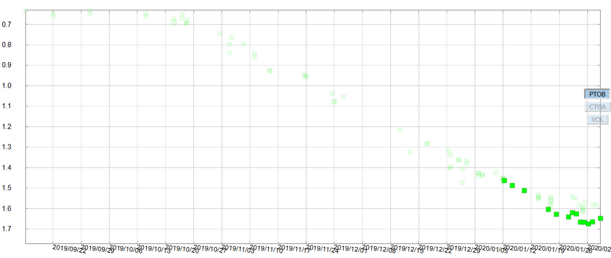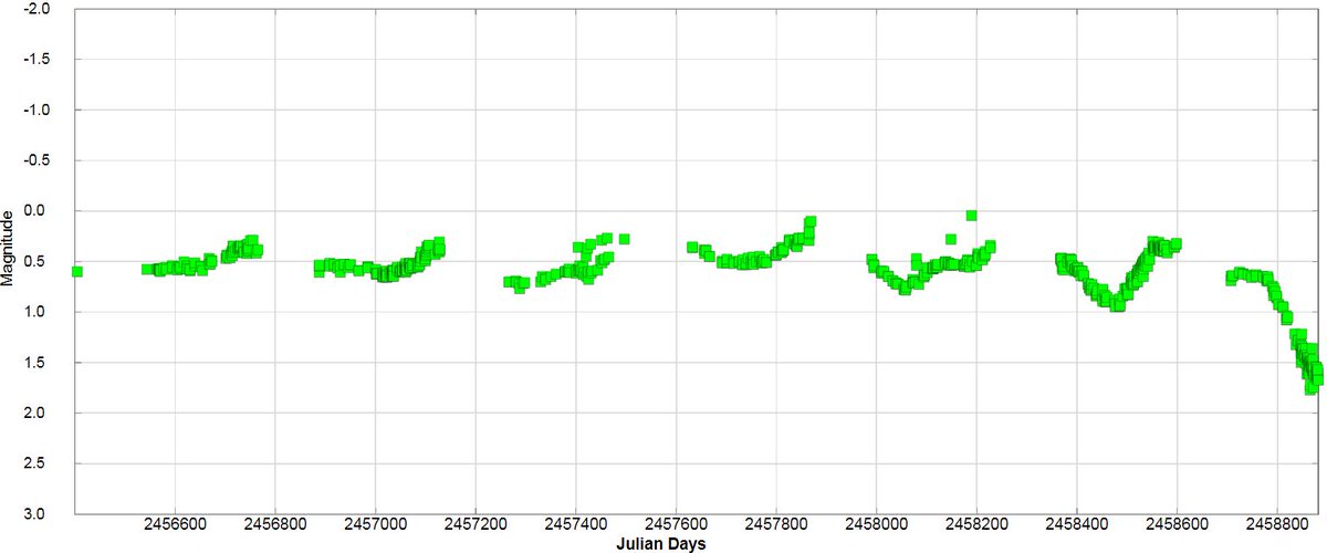 そう思ってAAVSOのデータを見たら、何となくそういう傾向が見える。この傾向を外挿すると、今年の5月頃に極小を迎えることが予想される。(データはAAVSOのサイトから取得。感謝します)※これは全くアテにならない予想です!信用しないで!pic.twitter.com/ZOCjtr9qhz