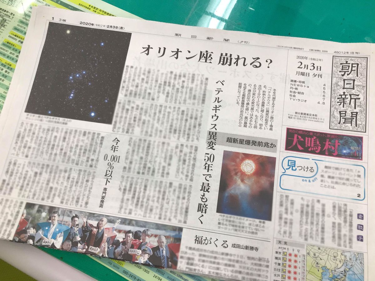 ベテルギウスの記事、夕刊1面トップ!で掲載されました (途中から新型肺炎のニュースが入って社会面に回っちゃったけど) 原稿は石倉記者(