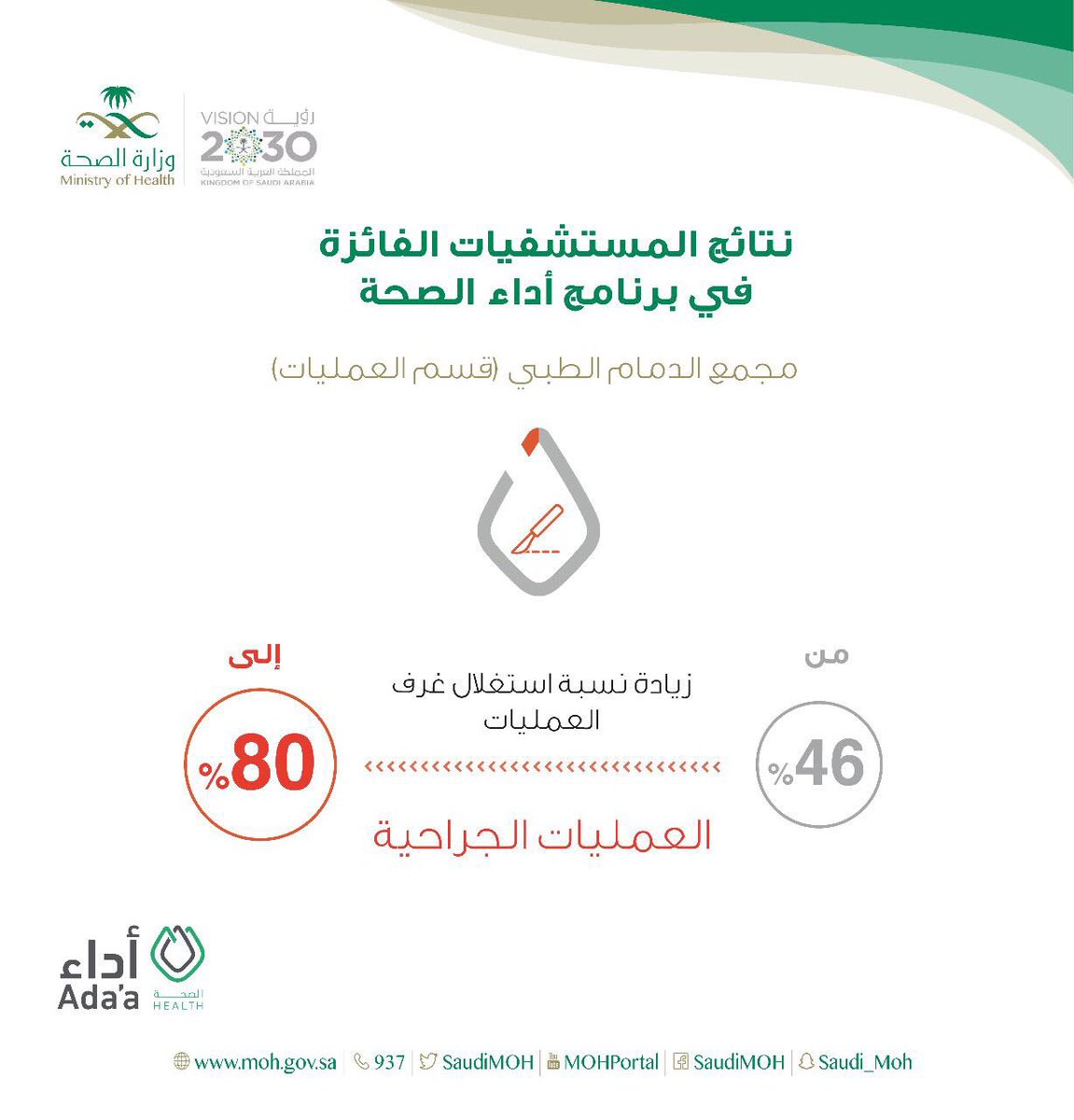 #برنامج_أداء_الصحة في مجمع الدمام الطبي بقسم العمليات من زيادة نسبة استغلال غرف العمليات الجراحية من 46% إلى 80%pic.twitter.com/Wpl4e8cIkp