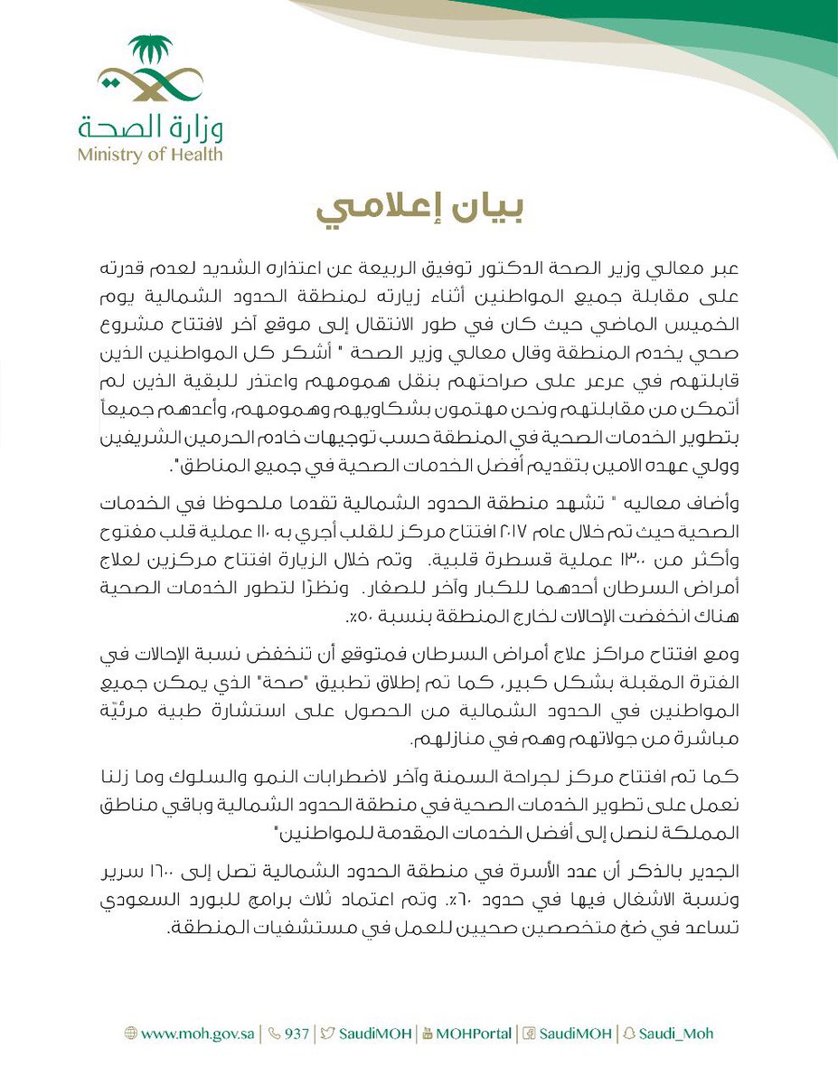 أعتذر للإخوة في عرعر. وأعدكم بأن تكون الخدمات الصحية في الحدود الشمالية وباقي مناطق المملكة أفضل وعند حسن ظنكم.https://twitter.com/saudimoh/status/947196791933603841 …