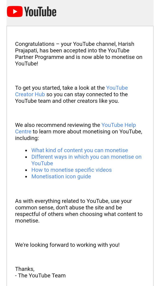 For approving my YouTube channel for YouTube Partner Programme...