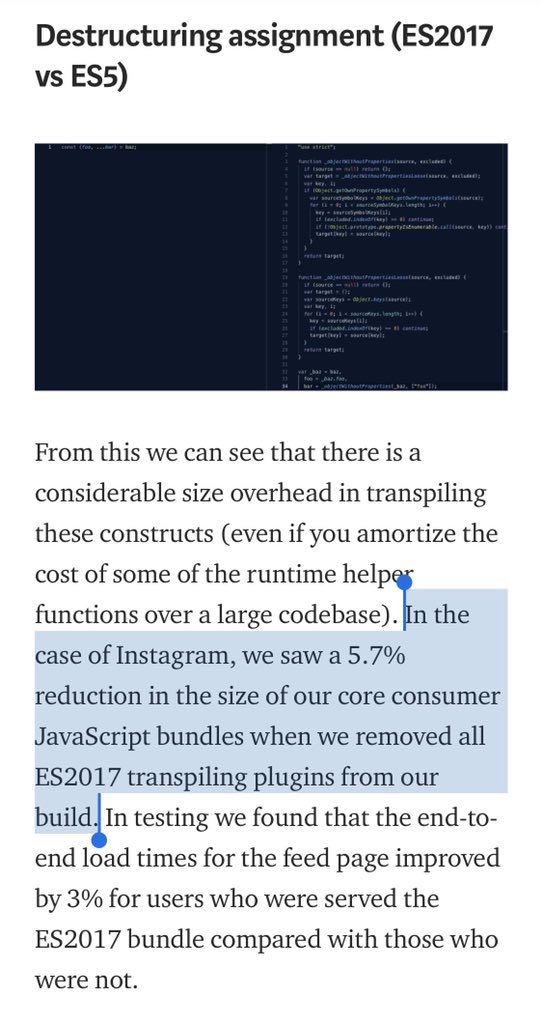 A different piece of data: Instagram removed all Babel syntax transforms and got bundles that are 6% smaller https://instagram-engineering.com/making-instagram-com-faster-code-size-and-execution-optimizations-part-4-57668be796a8 …pic.twitter.com/pQ24d1JIUY
