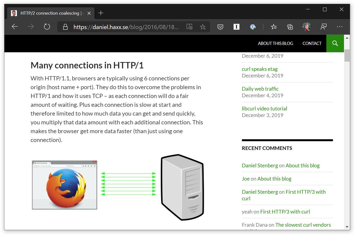 TIL about HTTP/2 coalescing. It’s a way for browsers to re-use a single connection for different domains – and it helps to work around domain sharding (= http://cdn1.website.com , http://cdn2.website.com , ...). Here’s how it works in practice: https://daniel.haxx.se/blog/2016/08/18/http2-connection-coalescing/ …pic.twitter.com/5Ie859gpXB