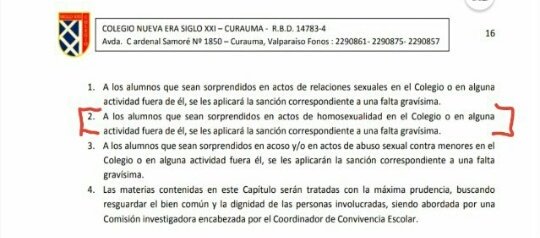 El "Colegio Siglo XXI" dentro de su normativa interna incluye la homosexualidad como falta gravísima. Es inaceptable que instituciones con este nivel de discriminación y violencia sigan teniendo la responsabilidad de educar.pic.twitter.com/l5pw3x3Iow