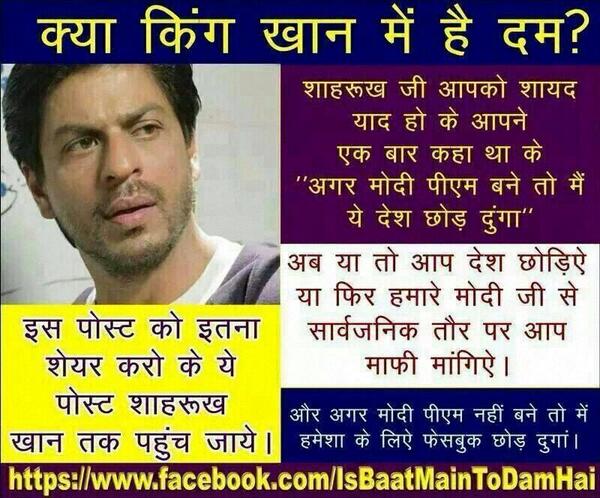 @iamsrk ur statement hurt us "if modi will become PM u will leave india " if that was true then time has come to take action... Plz leave -