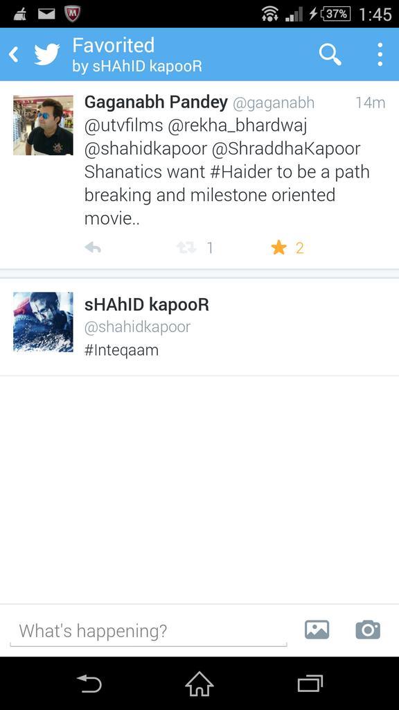 @IamPrathit take a look@shahidkapoor favourited my tweet.. Feeling insomniac now..#Shaandar#HaiderOnMyMindpic.twitter.com/ZafmRY7DTQ