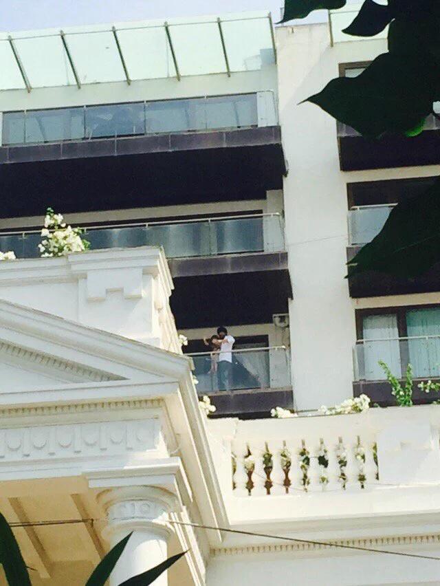 @iamsrk waves out to crowd outside with his lil one! Watch this space for more #HappyBirthdayKingKhanpic.twitter.com/Ey5hLxmZsQ