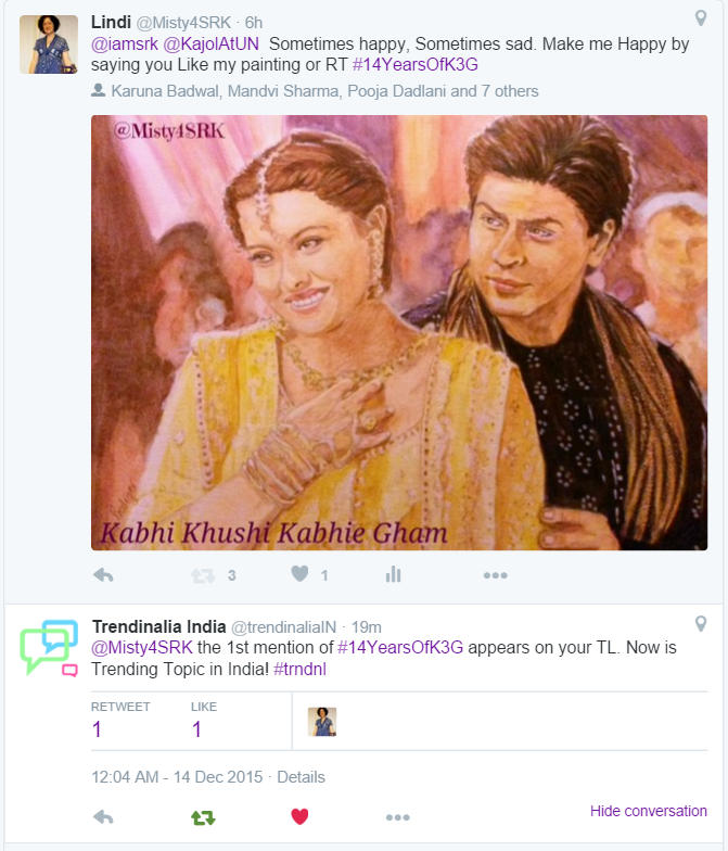 @iamsrk You &@KajolAtUN don't look any older than in my painting which topped the trends list#14YearsOfK3Gpic.twitter.com/cDgtXgdXv6