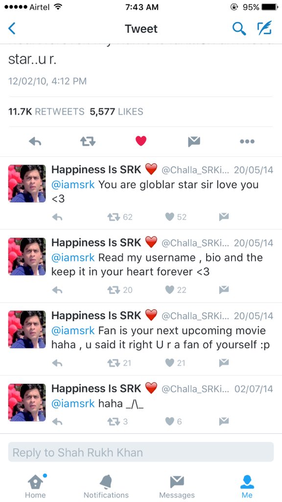 @iamsrk yeh tweet aaj ke time karte toh 10k+ RT mil jaate <3 My most Fav tweet of yours
