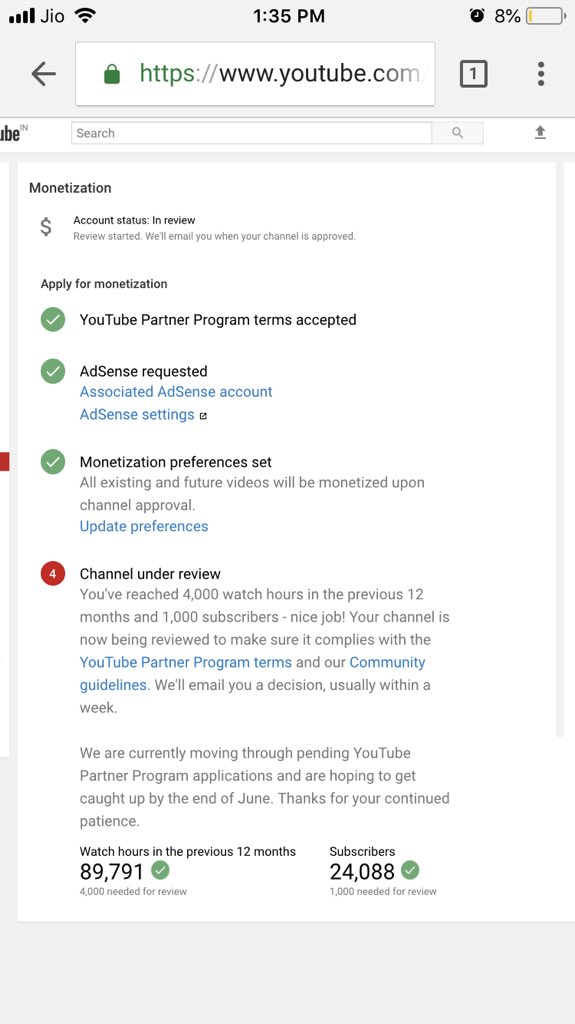 @TeamYouTube Hey Youtube Team, I applied for approval of my monetization approval since April 2018 But Still not reviewed. I Completed All Milestone & Now I have 89K+ Watchtime Hours & 24K+ Subscribers. Please Help?pic.twitter.com/QGXyeLSDqd