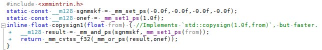 My version of `std::copysignf(1.0f,x)`, but 2.5× faster. Best of all, as per