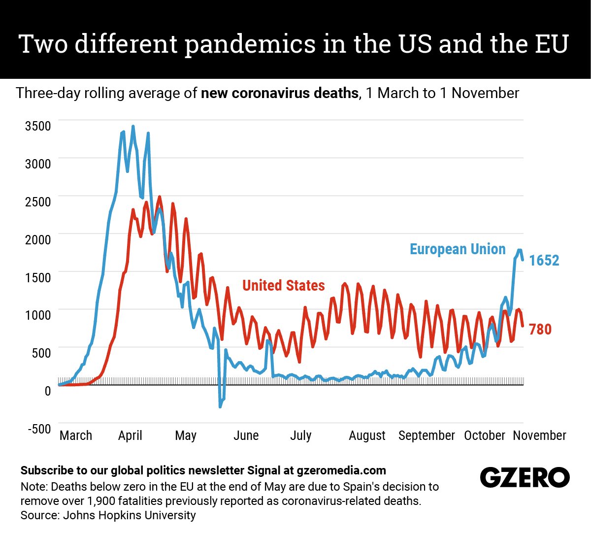 US v EU on coronavirus deaths. EU now also looking signficantly worse. Overall and per capita.pic.twitter.com/VYaJ1Xdbca