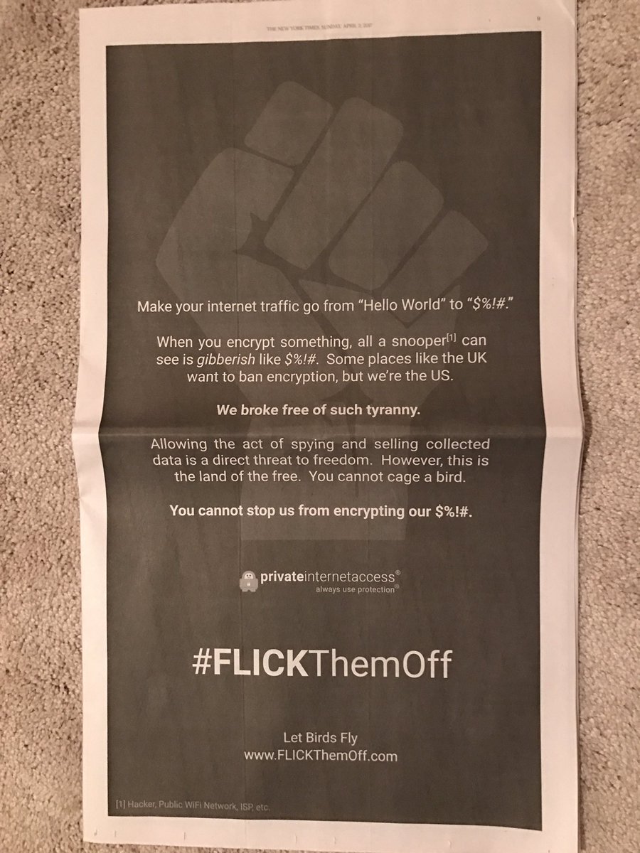 Private Internet Access, a VPN provider, takes out a full page ad in The New York Times calling out 50 senators.pic.twitter.com/Kn3xQJAVXI