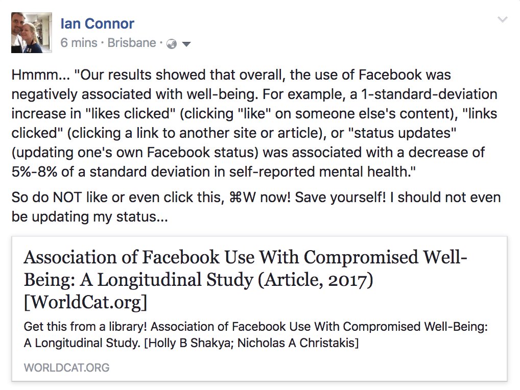 Facebook PSA time... we probably all knew it but each like, click or status update decreases your mental health. Save yourself - ⌘W now!pic.twitter.com/PzBjWL9fMc