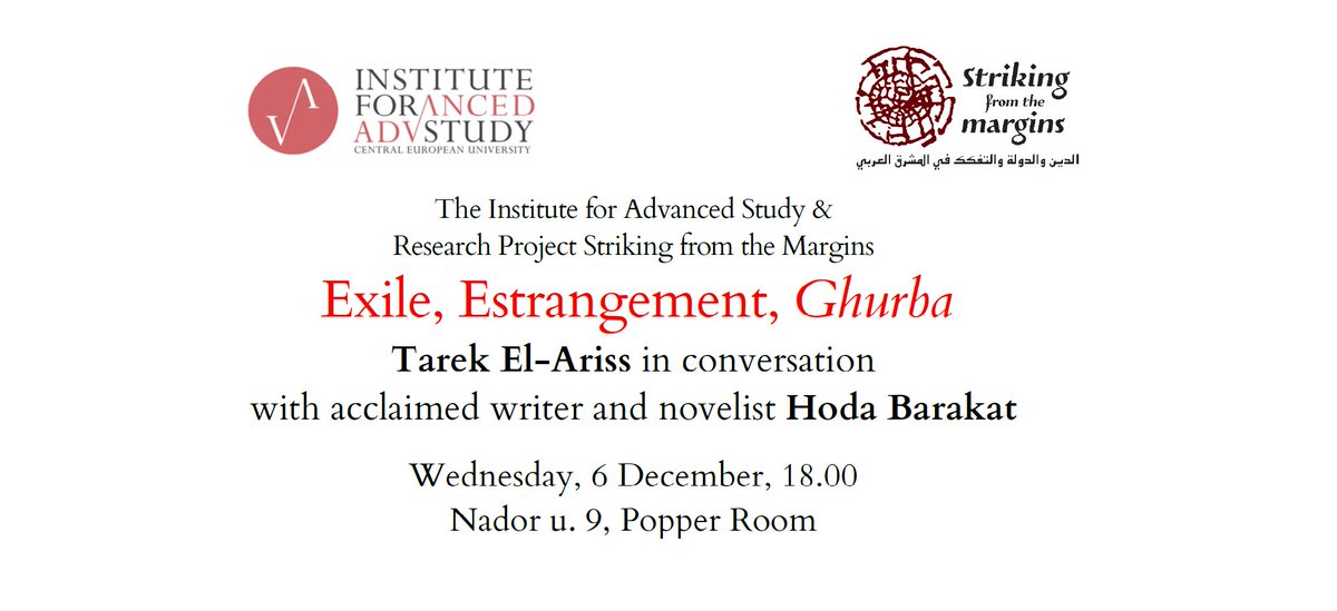 On Dec 6th Prof. Tarek El-Ariss will converse with the acclaimed writer and novelist Hoda Barakat about Exile, Estrangement. and Ghurba #IASCEU #EXILE #HodaBarakatpic.twitter.com/mooJ6GIrw0