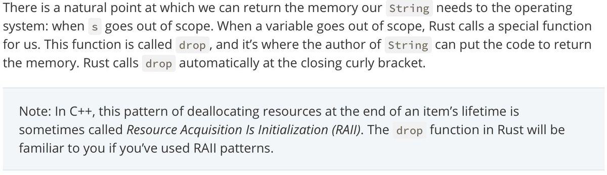 I’m finally taking the time to read the Rust book: having always believed that C++ most powerful feature is the closing curly brace, I’m super happy to learn that Rust embraces RAII!pic.twitter.com/c6u2FlPDlk