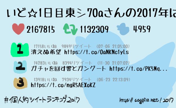#個人的ツイートランキング2017 いど☆1日目東シ70aさんは今年4959件のツイートをして、 2167815件のいいねと1132309件のリツイートをもらいました! 4位以降は→ https://cagpie.net/2017/u/b02dd43f pic.twitter.com/l944res3II