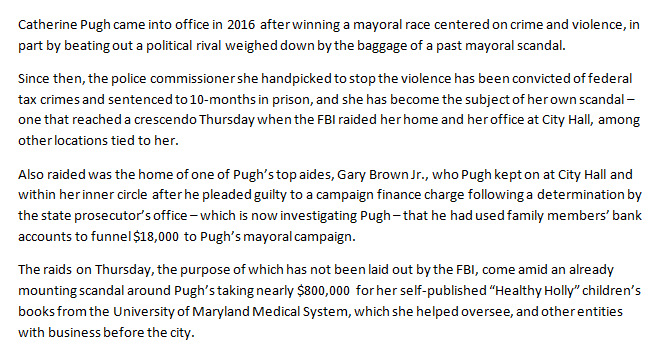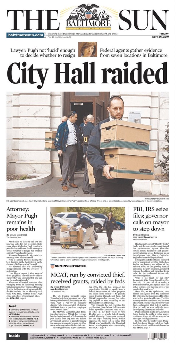 FBI RAIDS CITY HALL, MAYOR'S HOME MAINBAR: https://www.baltimoresun.com/news/maryland/baltimore-city/bs-md-ci-baltimore-20190424-story.html … RAID LOCATIONS: https://www.baltimoresun.com/news/maryland/baltimore-city/bs-md-ci-fbi-raid-locations-20190425-story.html … 7 INVESTIGATIONS: https://www.baltimoresun.com/news/maryland/baltimore-city/bs-md-umms-investigations-list-20190403-story.html … GOV TO MAYOR: RESIGN: https://www.baltimoresun.com/news/maryland/politics/bs-md-ci-hogan-pugh-resign-20190425-story.html … Also, days like today I just have to write things down to synthesize them in my head:pic.twitter.com/kdLt3dQWb6