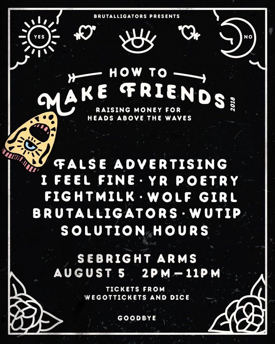 @falseadv@YrPoetry@ifeelfineband@wolfgirl_uk@fightmilkband@SolutionHours@WutipMusic and us raise some money for@HATW_uk. Y'all coming right? https://app.dice.fm/event/8vaa2-how-to-make-friends-2018-5th-aug-sebright-arms-london-tickets …pic.twitter.com/lN4MqPwy3h
