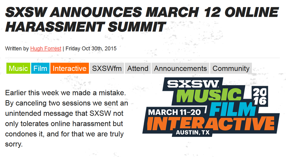 UPDATE: @SXSW has added more speakers to the Online Harassment Summit & moved the GamerGate panel to a separate day.pic.twitter.com/UZUgIz8Fyq