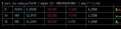 rate.sx shows only 10 coins by default. To override it use ?n= (1..200): $ curl http://btc.rate.sx/?n=30 You can combine it with egrep to select distinct coins, e.g.: $ curl http://rate.sx/?n=30 | egrep -C1 'XRB|MIOTA|OMG' | sed /^--/,+1dpic.twitter.com/fjB8bmiuQV