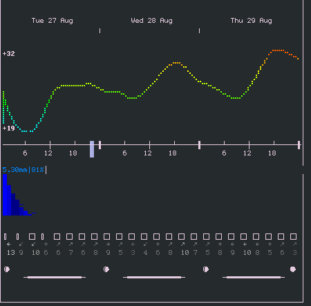 Looks pretty nice for me and I am running a pretty minimal st as my terminal. Is there support (now or planned) for some formatting/selection of info; I would like to cut out the moon and time stuff, maybe only just display data for day? Great work though, really amazing!