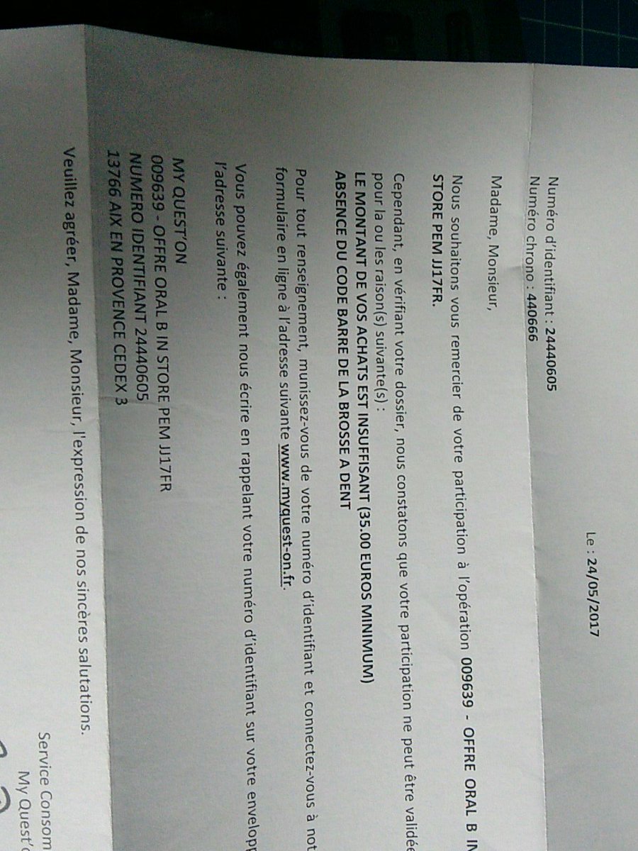 #myqueston a refusé mon ODR@OralB_FR pour achat insuffisants et code barre manquant. C'est un scandale.pic.twitter.com/lPAbpDHWUq